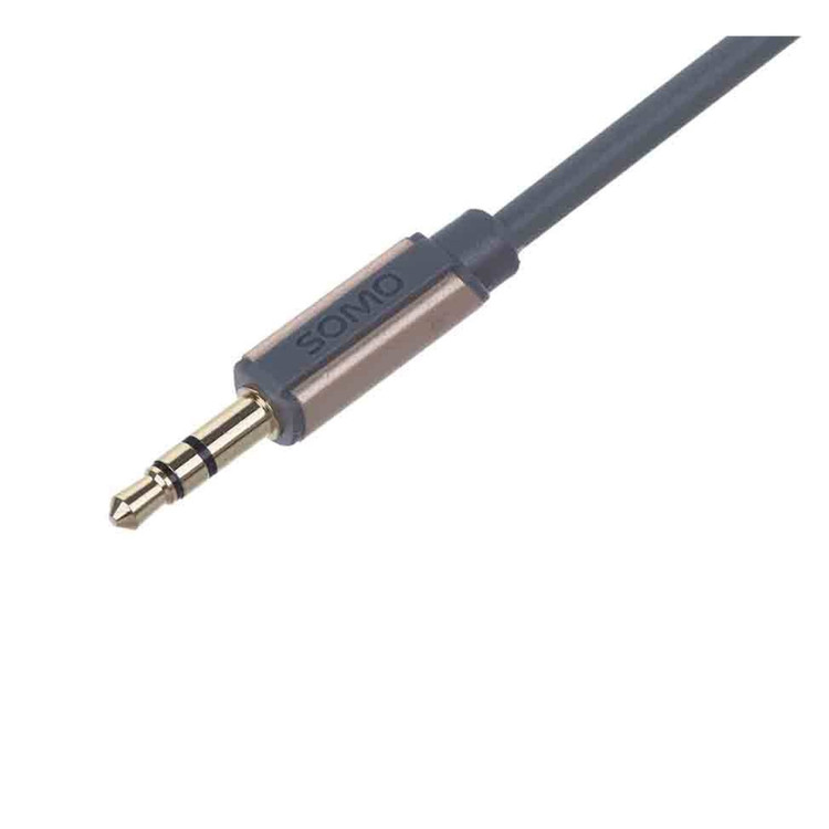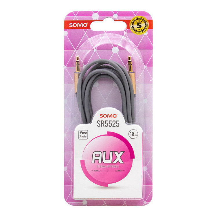 کابل انتقال صدا «سومو» (Somo) مدل «SR5525» دارای 180سانتیمتر طول است و کانکتورهای 3.5میلیمتری صدا در آن با انواع دستگاههای مجهز به این درگاه مانند گوشیهای موبایل، تبلت و... سازگاری دارند. کابل SR5525دارای کانکتورهایی از جنس فلز طلاست و به همین دلیل میزان انتقال نویز را به حداقل میرساند. این کابل با داشتن کانکتورهای 3.5میلیمتری مقاوم، امکان انتقال استریو صدا و موسیقی را از دستگاههای پخشکننده به گیرندههایی با این درگاه میسر میکند. استفاده از این کابل یکی از بهترین و سادهترین راهها برای پخش موسیقی موردنظرتان از گوشی موبایل، تبلت یا دستگاه پخش موسیقی حملشدنی (MP3 Player) به یک سیستم استریوی خانگی یا دستگاه پخش خودروست. هر سمت از این محصول یک کانکتور 3.5میلیمتری قرار گرفته که با انواع گوشیهای موبایل، تبلت، موزیکپلیر، لپتاپ، کامپیوتر و دیگر دستگاههای مجهز به این درگاه سازگاری دارد؛ همچنین رشتههای سیمی در این کابل با روکشی از جنس پلاستیک PVC پوشانده شدهاند. این روکش باعث انعطاف زیاد کابل میشود و استفاده از آن را برای کاربر راحتتر میکند.