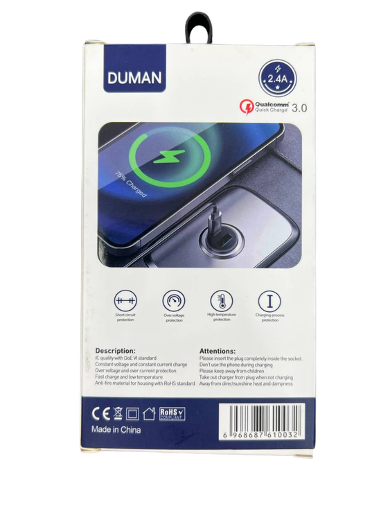 🔌 شارژر فندکی Duman مدل D-C03 یک گزینهای حرفهای و کارآمد برای شارژ وسایل الکترونیکی شما در خودرو است. این محصول دارای دو پورت خروجی (USB و Type-C) بوده و از فناوریهای PD (Power Delivery) و QC 3.0 (Quick Charge 3.0) پشتیبانی میکند، بنابراین امکان شارژ سریع و امن گوشی، تبلت و سایر دستگاههای پشتیبان این فناوری را فراهم میسازد.