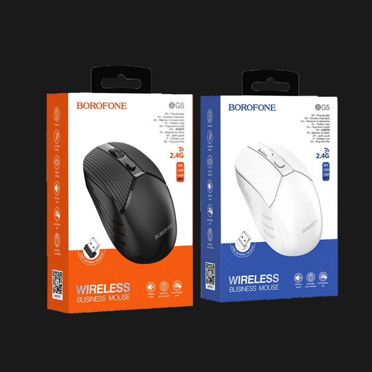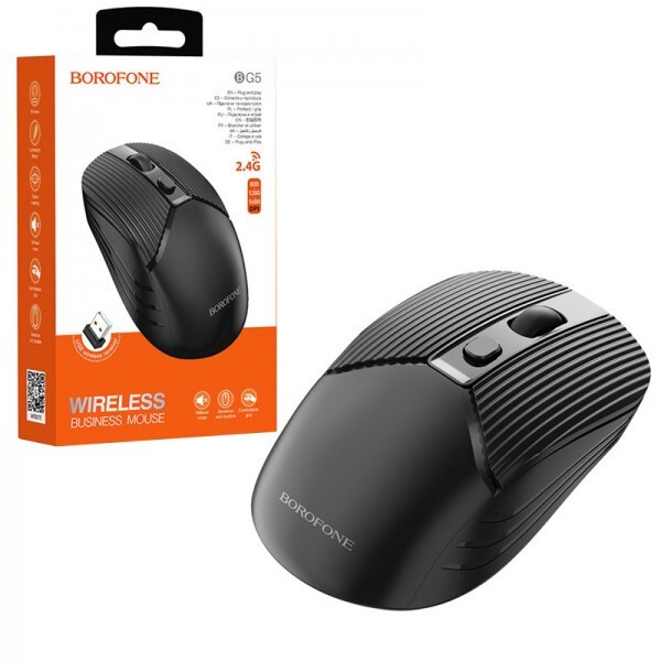 ماوس بیسیم Borofone BG5 از طریق دانگل USB و ارتباط ۲٫۴ گیگاهرتز فعالیت میکند. چند سطح دقت حسگر (DPI) دارد — معمولاً ۸۰۰، ۱۲۰۰ و ۱۶۰۰ نقطه بر اینچ — که امکان تطبیق با استفادههای متنوع (وبگردی، کار اداری، لپتاپ) را میدهد. بدنه از پلاستیک مقاوم (ABS) ساخته شده و وزن سبک (حدود ۵۵ گرم) دارد که برای استفادههای طولانی مناسب است. ماوس دارای طراحی پایهای و جمعوجور است (ابعاد تقریباً 108×64×35.5 میلیمتر) برای کاربری روزمره.